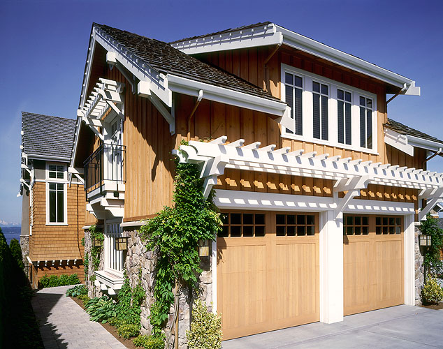 Outside, a combination of trellises, corbels, arched beams, stucco, and stone create a romantic play of light and shadow. The home includes upper and lower decks with pedestal-set pavers and wrought iron railings to complement an unobstructed view of Puget Sound and the Olympic Mountains.